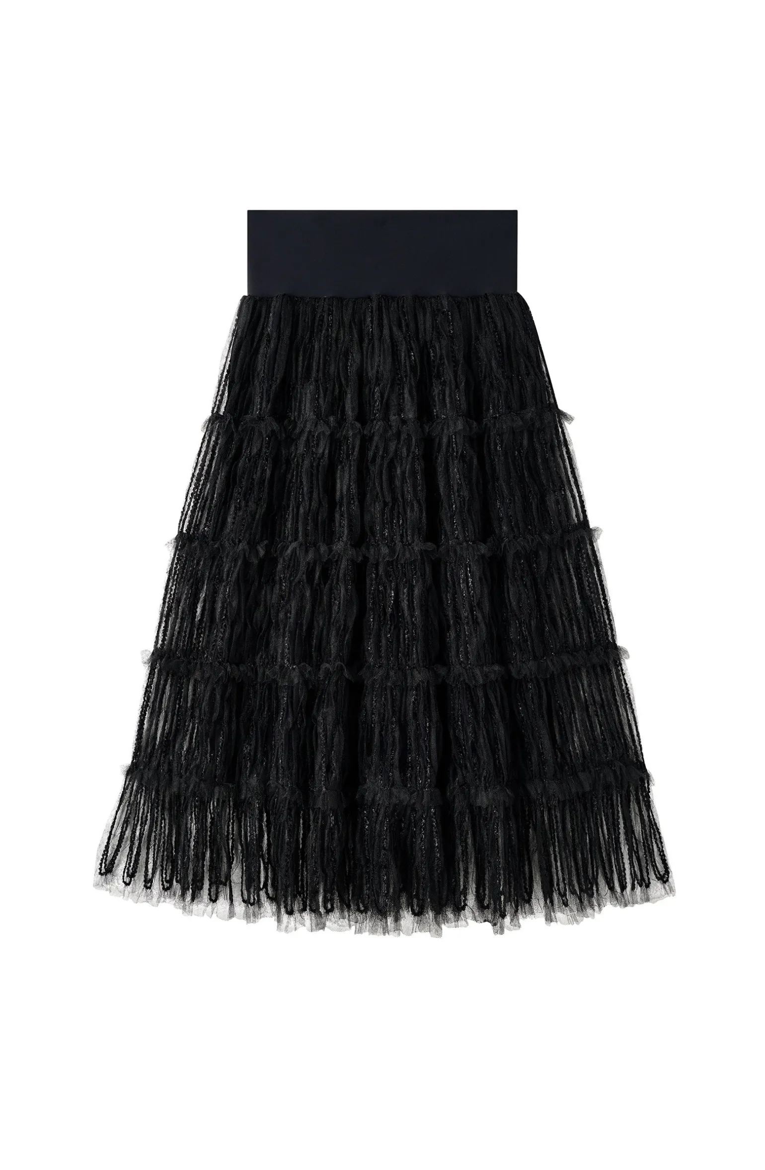 La jupe longue JULICIA est une création tout en finesse. Doublée d’un jupon, les pans de résille plissée se parent de serpentins de velours, dans un jeu délicat d’ajours et de coutures. Le noir, couleur intemporelle et toujours élégante.