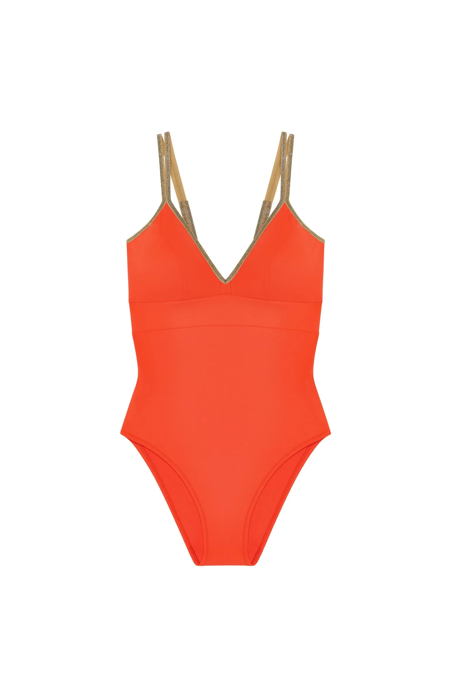 Avec sa large ceinture sous poitrine, le une pièce LAOS offre un excellent maintien. Les pinces de profondeur sous les bonnets dynamisent le décolleté qui est sublimé par une finition en lurex doré. Un maillot à la coupe très graphique qui convient à toutes les morphologies. Un orange moderne, intensément vitaminé.