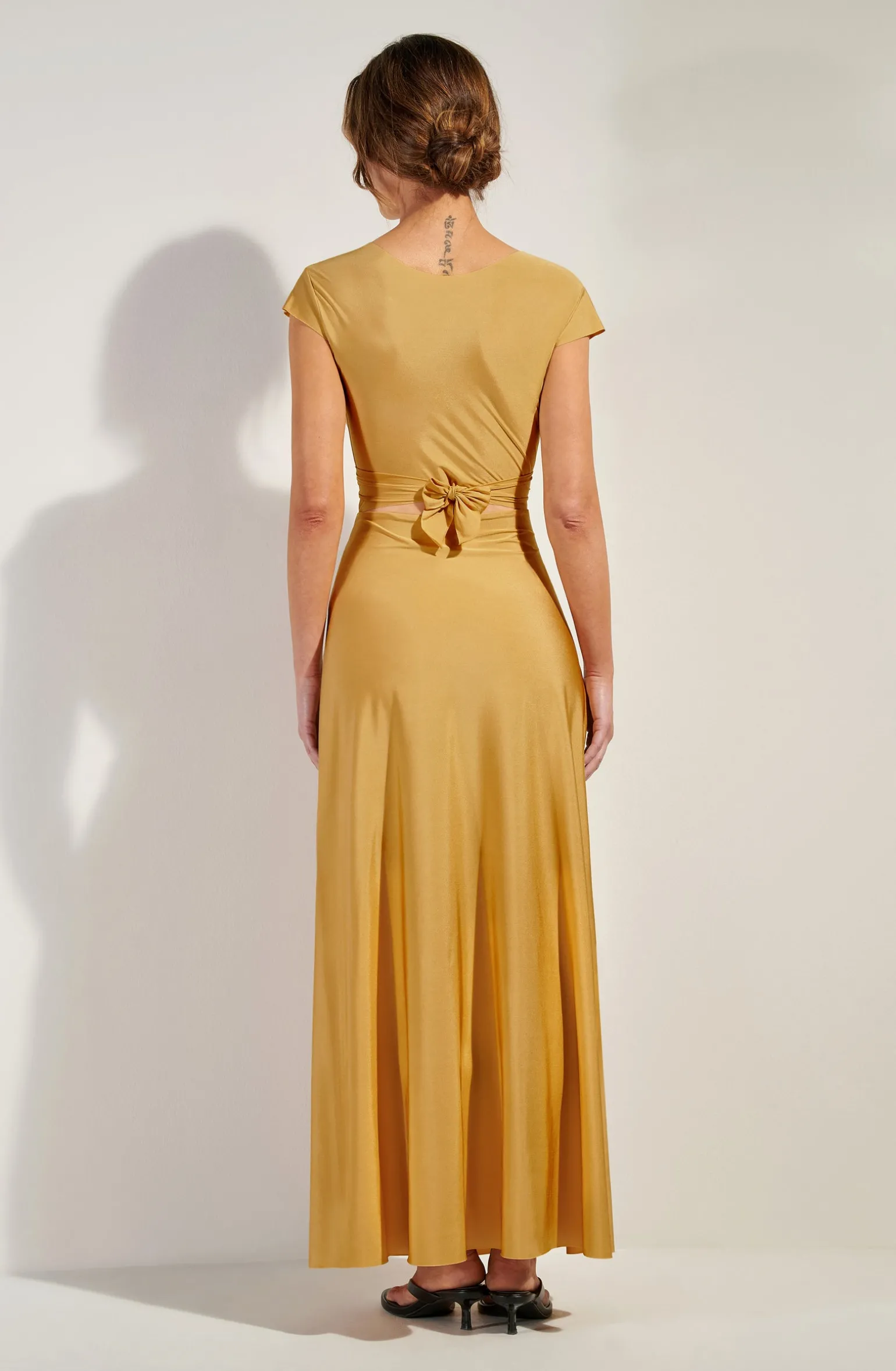 La robe longue et fluide LIL combine crop-top et jupe droite pour une silhouette élancée. Pièce créative dans un esprit couture, elle se porte devant-derrière et se noue de multiples façons pour jouer du décolleté et affirmer sa féminité. Gold, un jaune doré solaire.