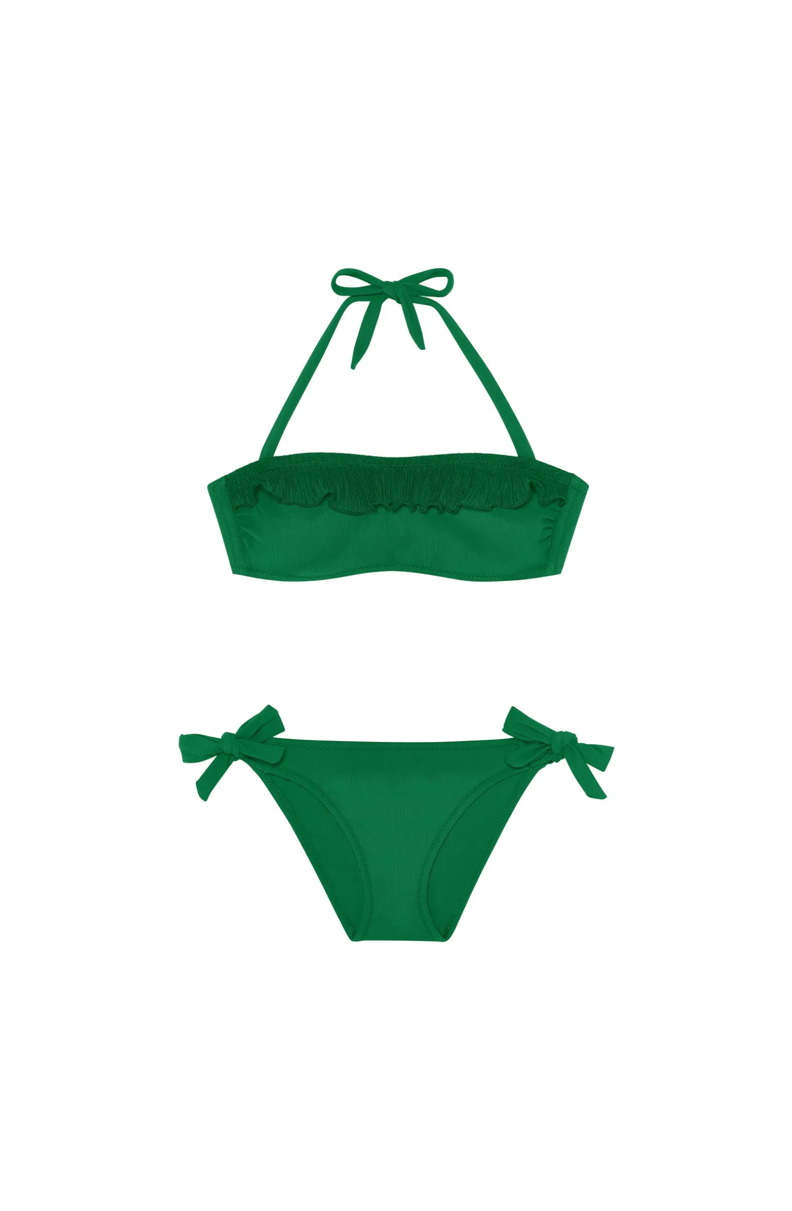 La brassière et la culotte de bain du maillot deux pièces LOUNA pour enfant se parent de volants en mousseline plissée. Le bas se noue sur les côtés pour s’ajuster à la taille et le haut s’attache derrière la nuque. Jade, un vert prononcé intensément doux et lumineux.