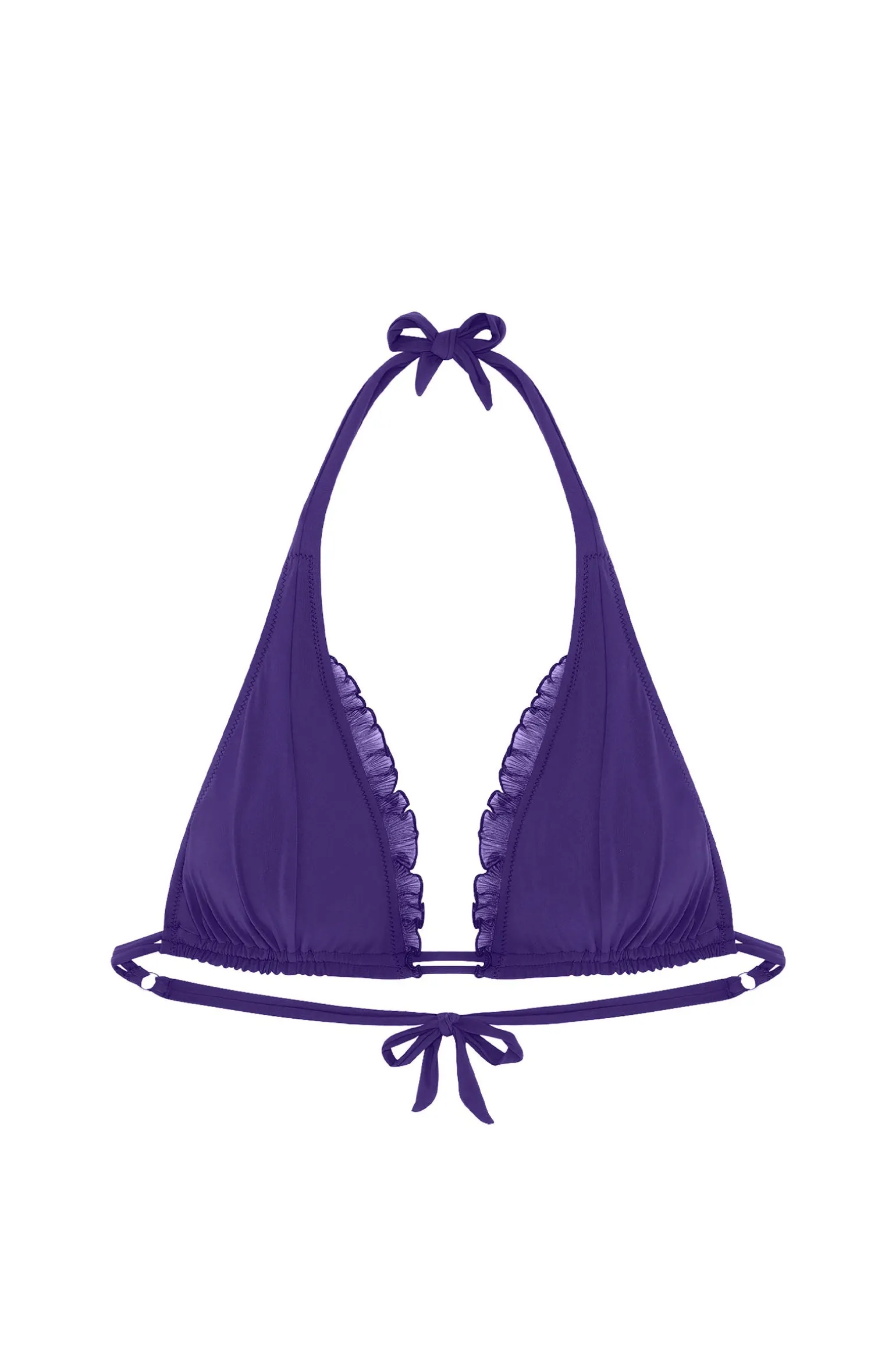Avec ses coques amovibles, le haut de maillot MAELYS sublime toutes les poitrines et assure un maintien parfait grâce à son double lien coulissant. On tombe sous le charme de ses petits volants en voile plissé qui entourent le décolleté avec légèreté en lui donnant du volume. Les larges bretelles intégrées aux bonnets se nouent dans le dos et la nuque avec élégance. Purple, un coloris subtil et affirmé, sur des nuances violet indigo.