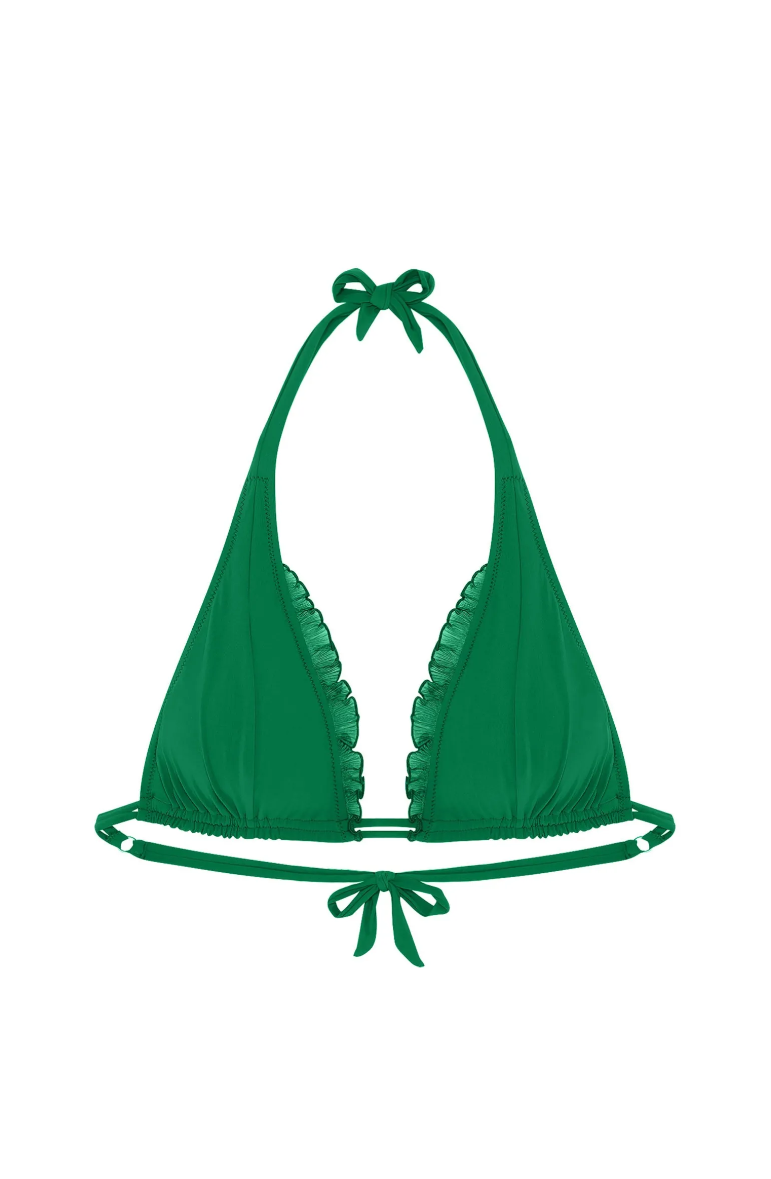Avec ses coques amovibles, le haut de maillot MAELYS sublime toutes les poitrines et assure un maintien parfait grâce à son double lien coulissant. On tombe sous le charme de ses petits volants en voile plissé qui entourent le décolleté avec légèreté en lui donnant du volume. Les larges bretelles intégrées aux bonnets se nouent dans le dos et la nuque avec élégance. Jade, un vert prononcé intensément doux et lumineux.