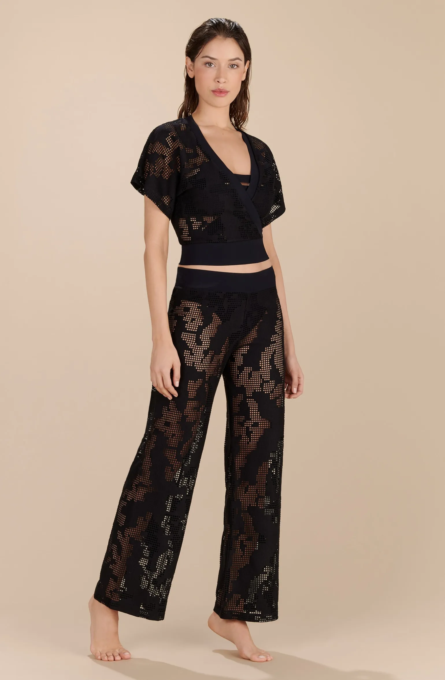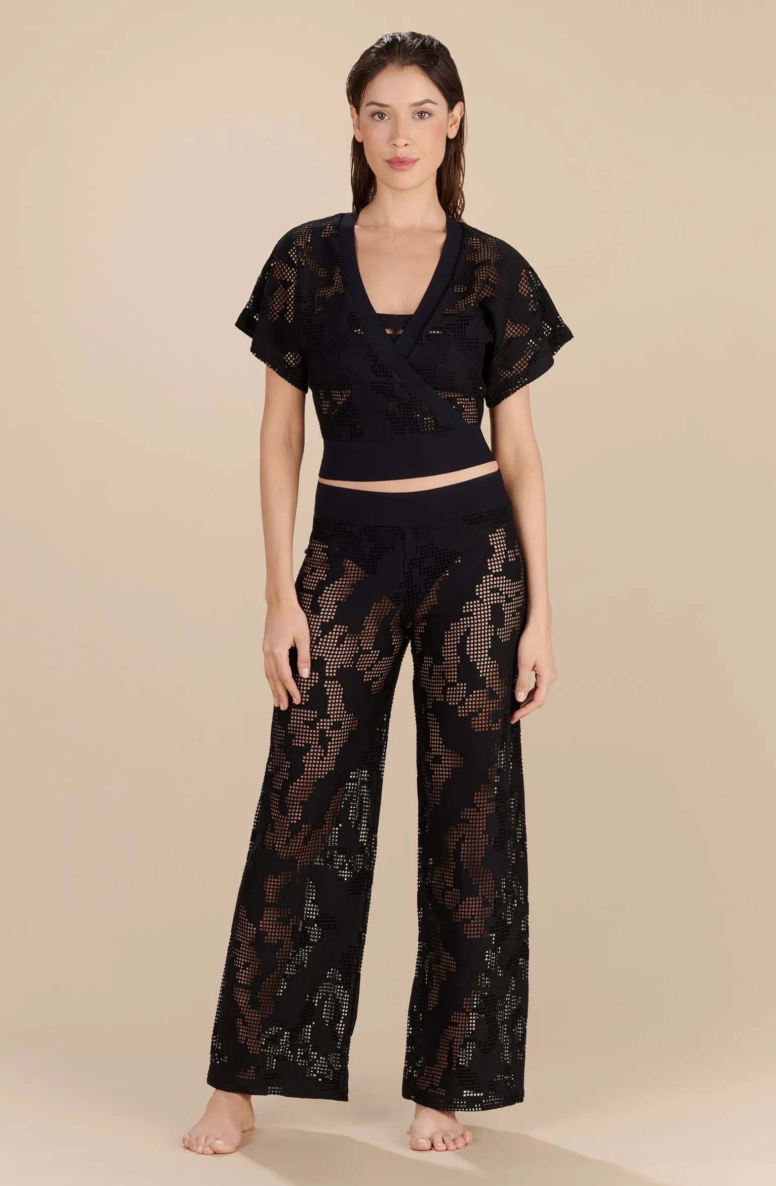 Top cache-coeur en résille ajourée. Larges manches courtes. Bande de finition en « bonded » sur le décolleté. Large ceinture en « bonded » nouée dos.