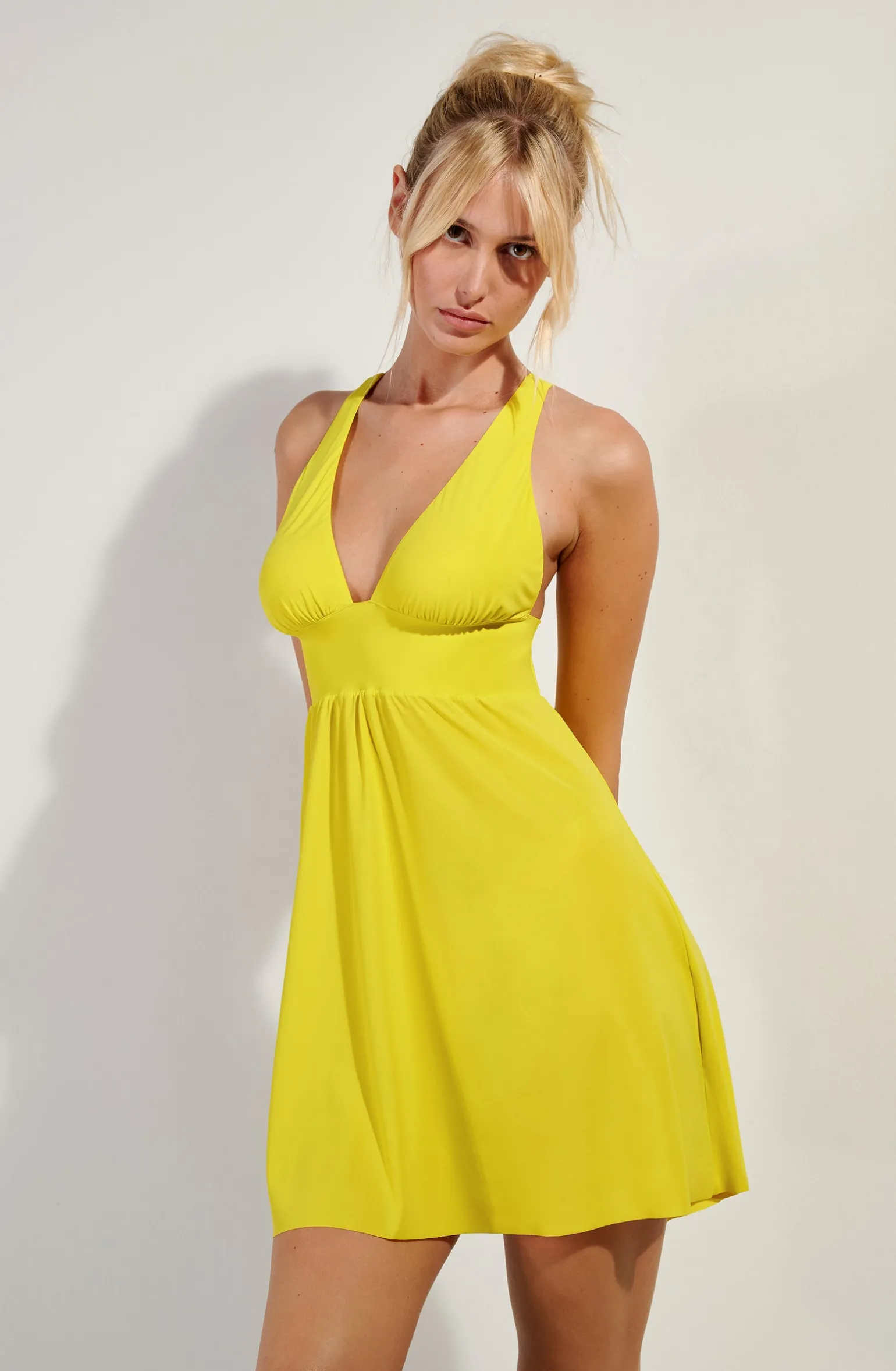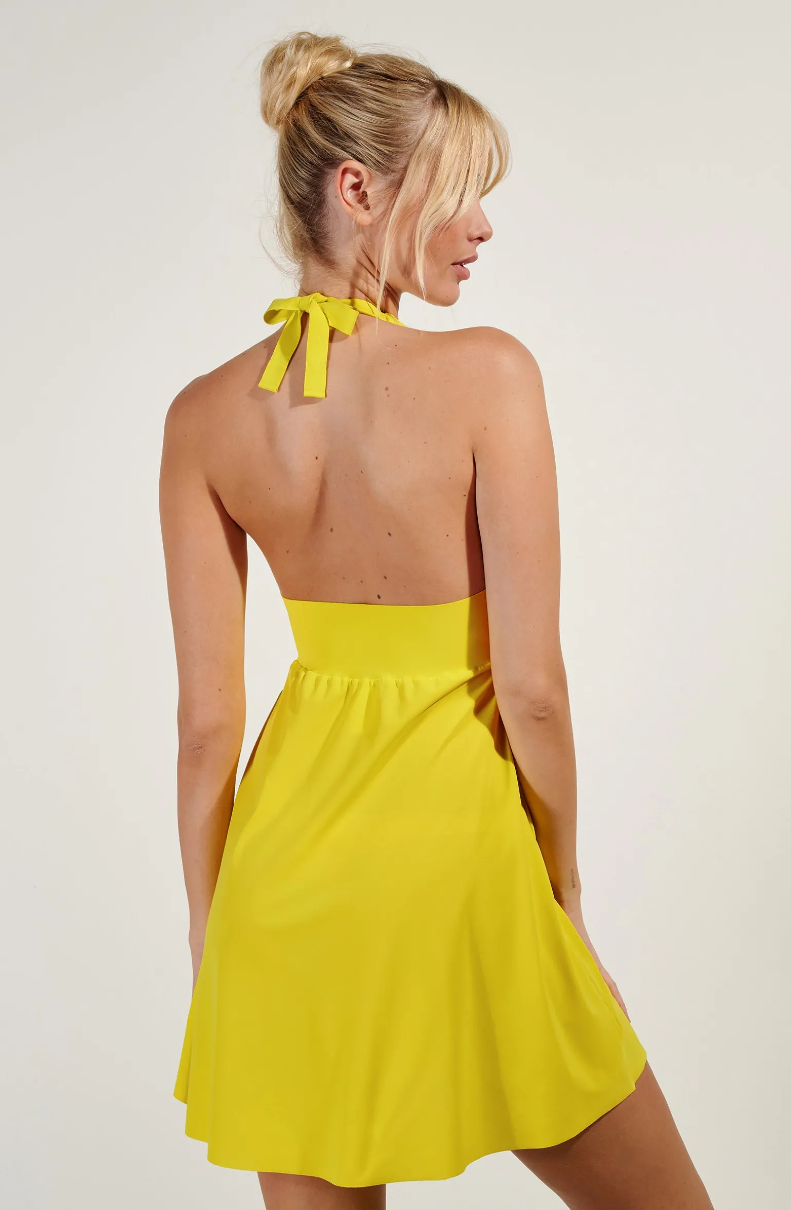 Avec ses lignes épurées, la robe courte en voile extensible MARYLOU offre une silhouette gracile. Une large bande de bonded souligne élégamment le décolleté en lui assurant confort et maintien. Ses bretelles se portent droites, croisées dans le dos ou nouées derrière la nuque pour jouer des styles en toute liberté. Citron, un jaune acidulé profondément vitaminé.