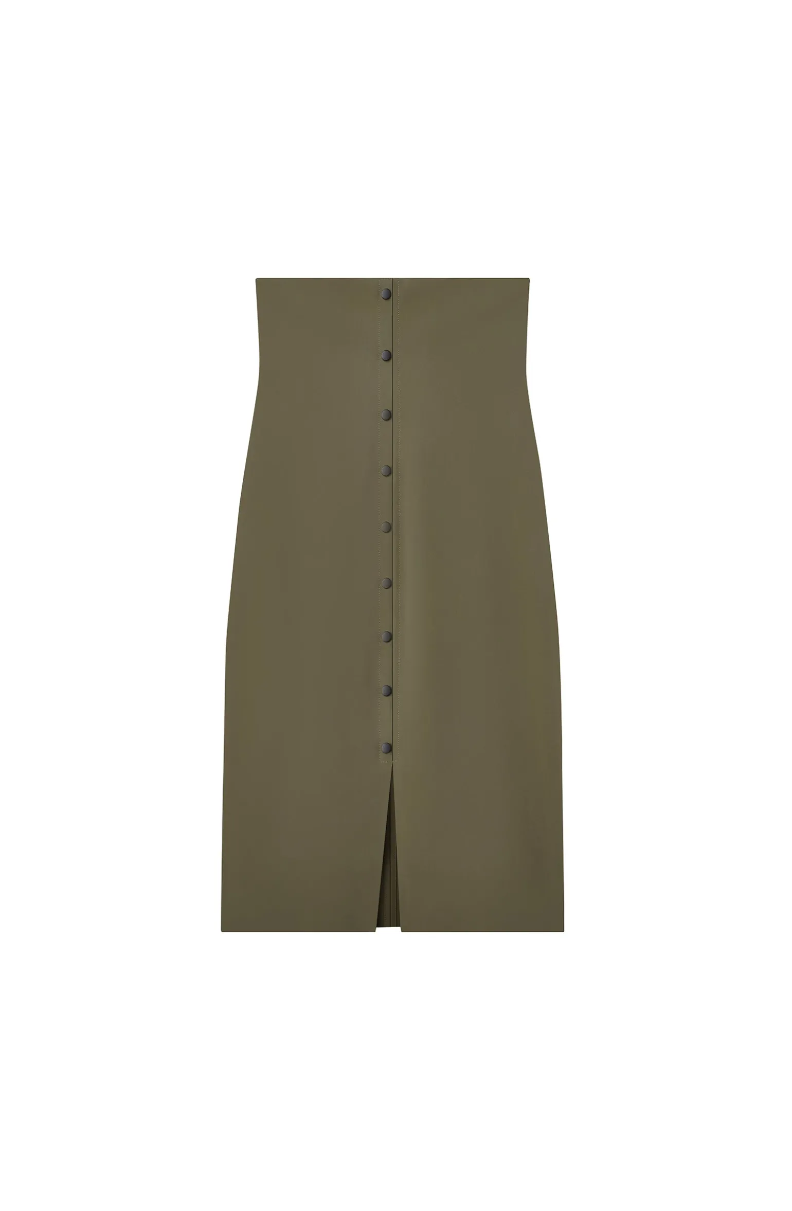 Avec sa taille haute sans couture, la jupe crayon MYLENA se porte indifféremment avec les boutonnières à l’avant ou à l’arrière, pour souligner la silhouette. Lichen, une teinte organique, vert kaki.