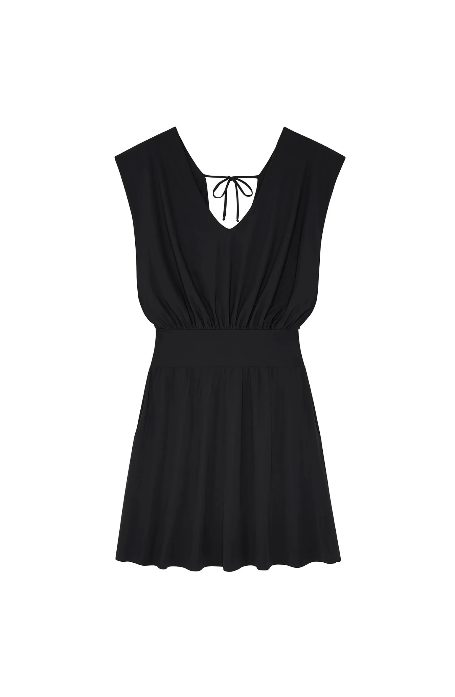 La robe courte NOLA se porte en toute occasion, changeant de style en un tour de manche. Pour une silhouette décontractée, le haut se porte ample, les manches sur les épaules. Elles s’entrecroisent pour une tenue plus sophistiquée, ou se portent de façon asymétrique pour une allure libre et affirmée. Le noir, couleur intemporelle, toujours élégante.