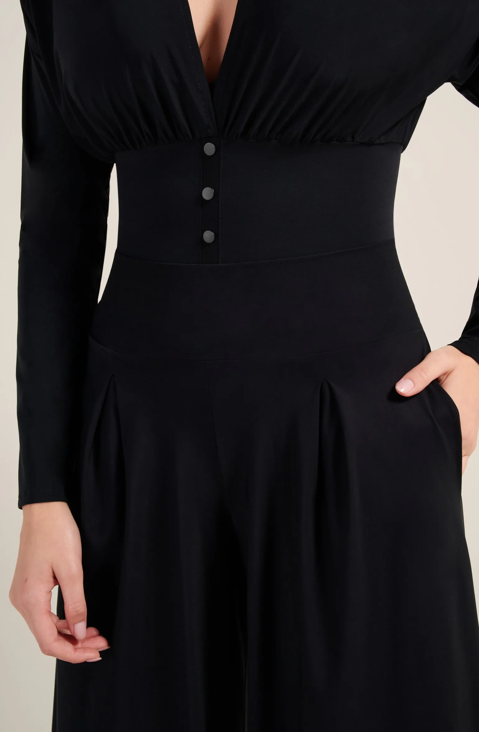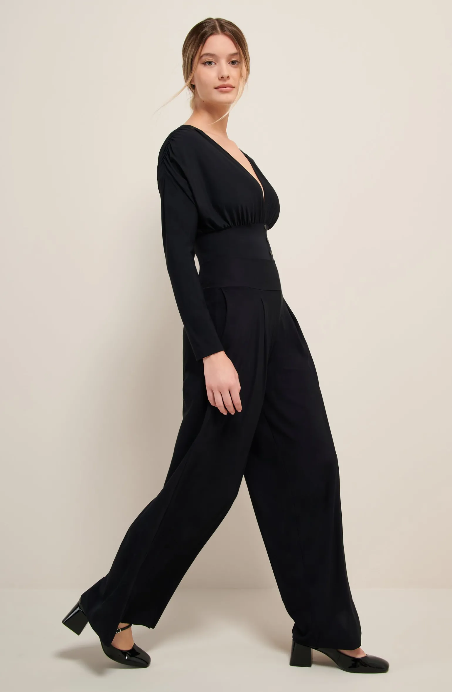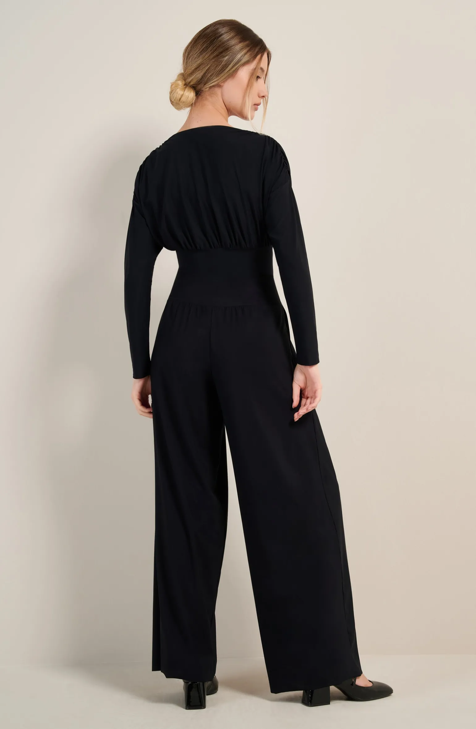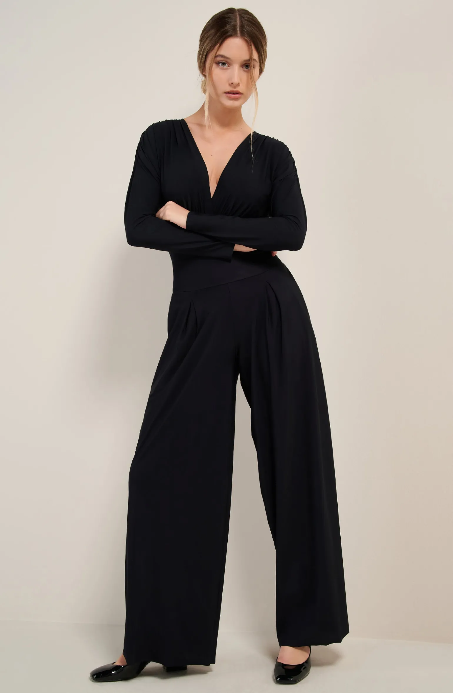 Le pantalon ample PANNA équilibre la silhouette avec style et confort. La large ceinture extensible épouse la taille sans la contraindre et la maille souple structuré de pinces assure un tombé fluide. Le noir, couleur intemporelle et toujours élégante.