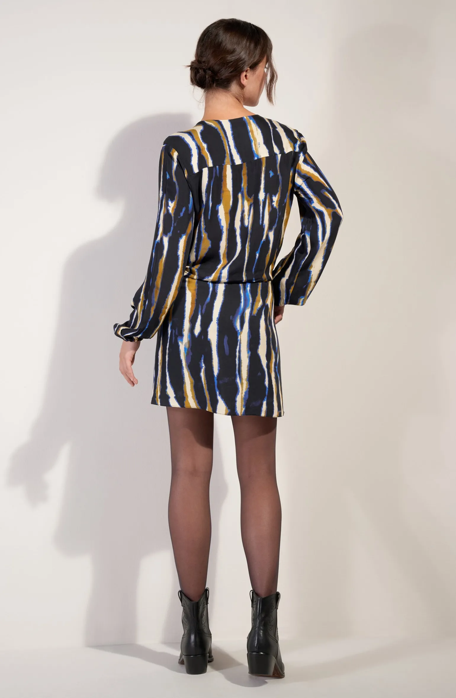La robe portefeuille Raisa souligne la taille avec légèreté et créativité. Le bas joue d’asymétrie avec raffinement et le haut dessine un décolleté effet cache-cœur. Avec ses manches longues bouffantes, cette pièce fluide et élégante se porte en toute saison. Tie And Die, un imprimé rayonnant. Son dégradé, du bronze au bleu franc, attire le regard.