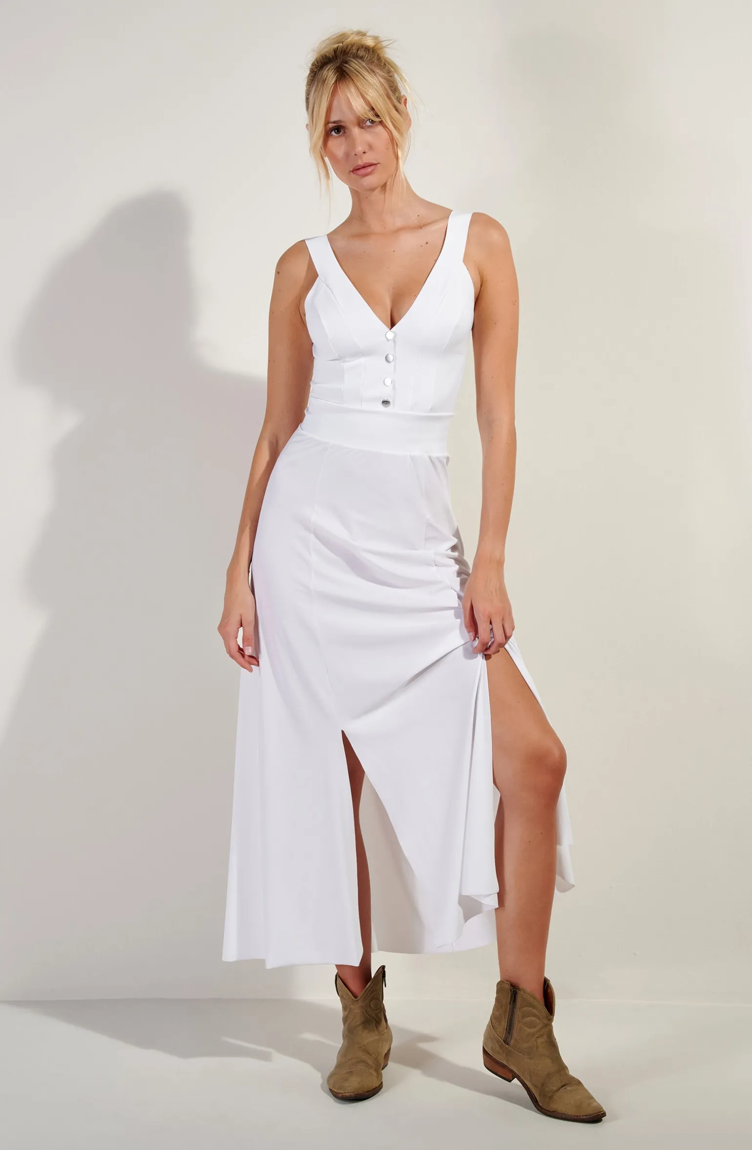 Le haut de la robe longue RALIA s’inspire des iconiques maillots de bain nageur de la maison Pain de Sucre. Profondément décolletée, cette robe se pare de boutons de manchettes réversibles. Détail sophistiqué qui sublime les formes avec fantaisie et souligne la féminité. Pur et délicat, le blanc illumine le teint.