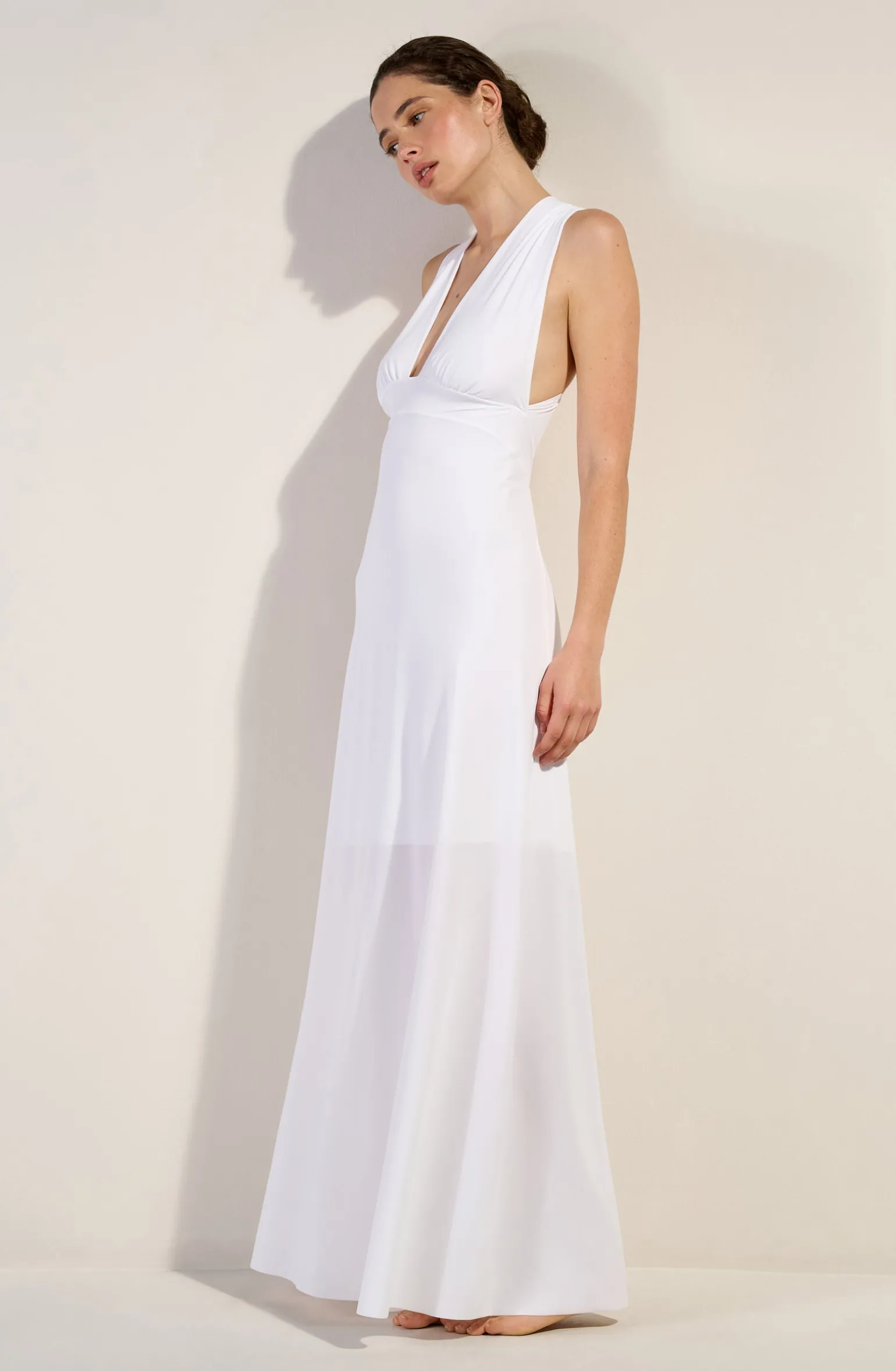 Avec ses lignes pures et dynamiques, la robe longue fluide REENA affine la silhouette et galbe les formes. Devant les larges bonnets froncés mettent en valeur le décolleté. Derrière, les bretelles croisées s’ajustent pour sublimer le dos nu. Pur et délicat, le blanc illumine le teint.