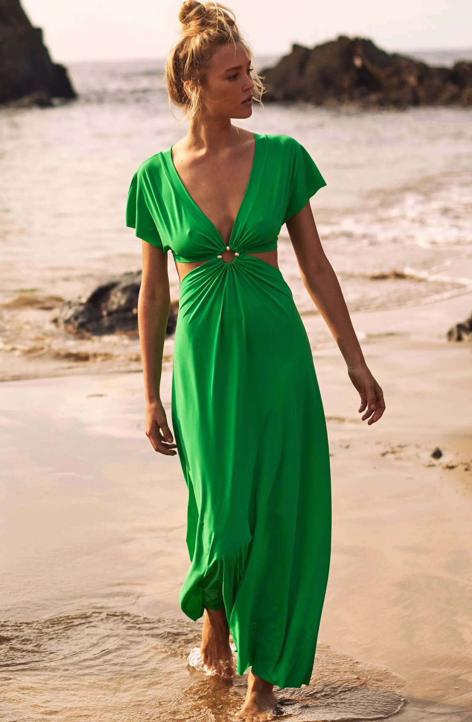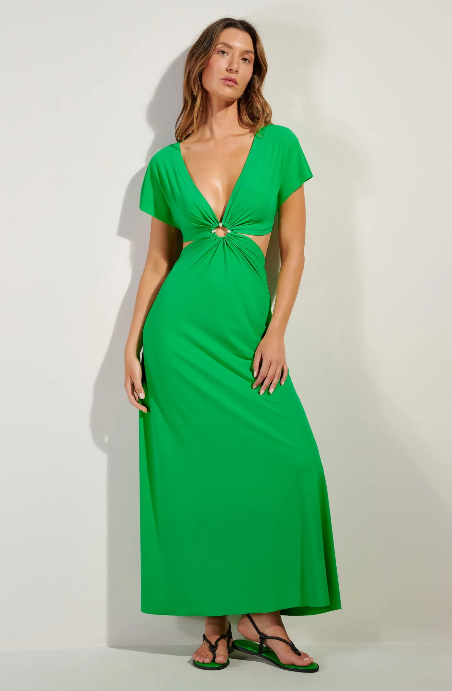 La robe longue échancrée RISLENE offre une allure moderne et audacieuse. Son haut à manches courtes se drape autour d’un ajour, dévoilant trois perles nacrées et se prolonge en une longue jupe fluide. Pomme, un vert lumineux et pétillant.