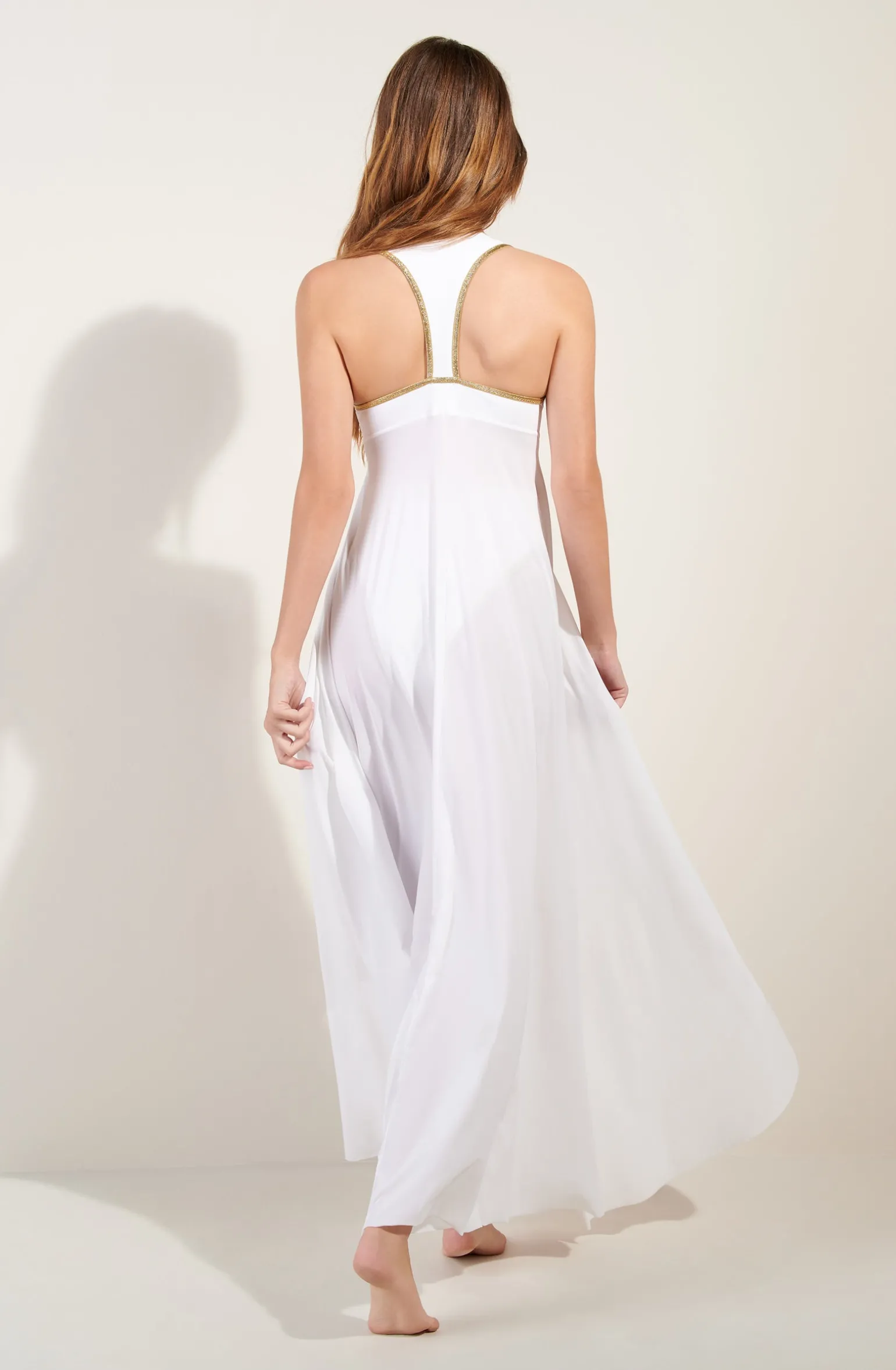 ROSANE joue des volumes avec raffinement. En voile de lycra, cette longue robe ouverte se ferme délicatement entre les seins. L’emmanchure américaine et le pourtour du décolleté se parent de lurex doré pour faire rayonner la silhouette. Pur et délicat, le blanc illumine le teint.
