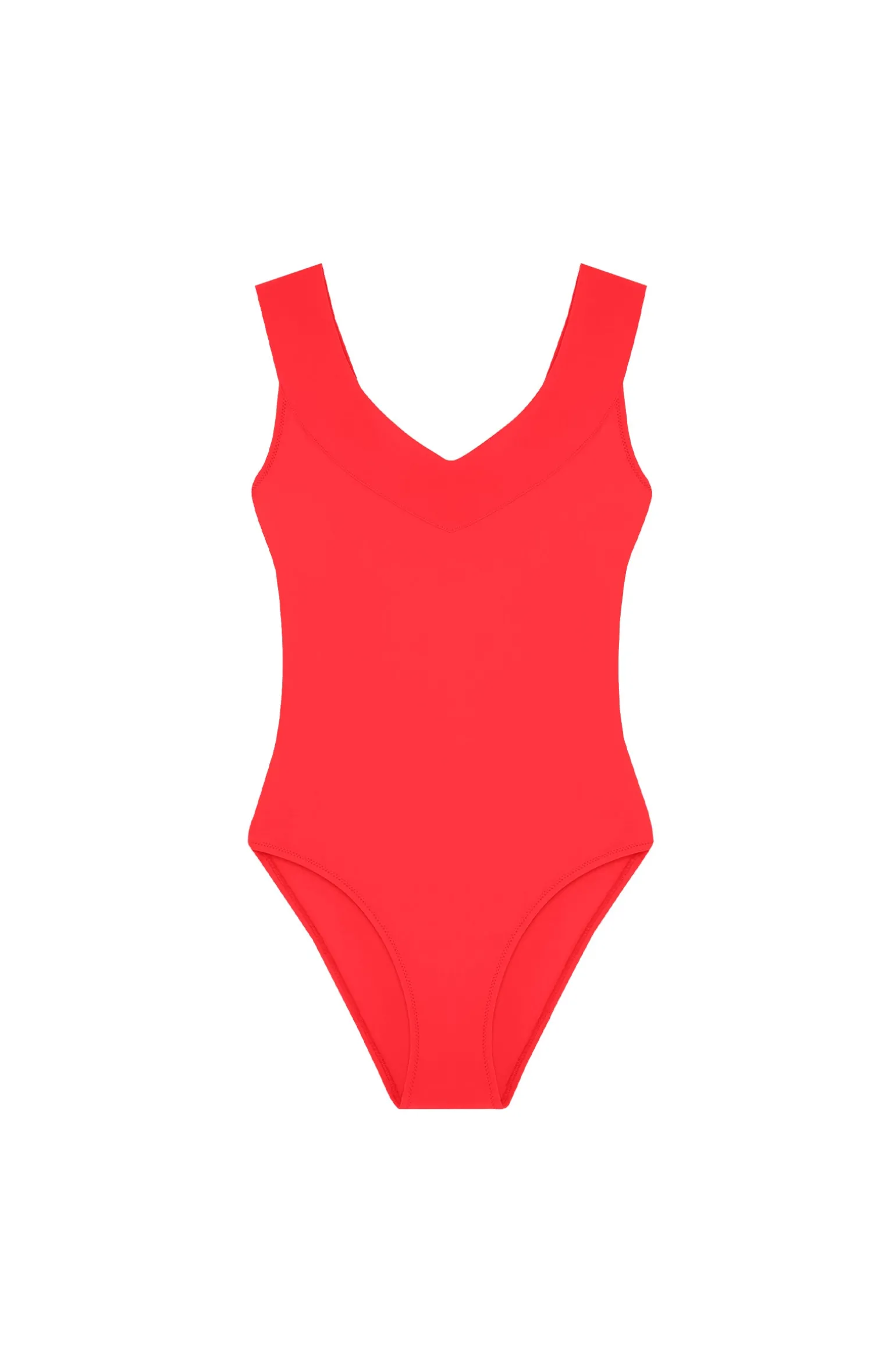 Iconique, le une-pièce SOYA revisite avec style le maillot de bain nageur. Les lignes graphiques des bretelles croisées soulignent avec élégance le dos nu et le décolleté plongeant met en valeur la féminité. La coupe parfaitement ajustée assure confort et maintien tout en sublimant la silhouette. Groseille, un rouge vif, gorgé de soleil.