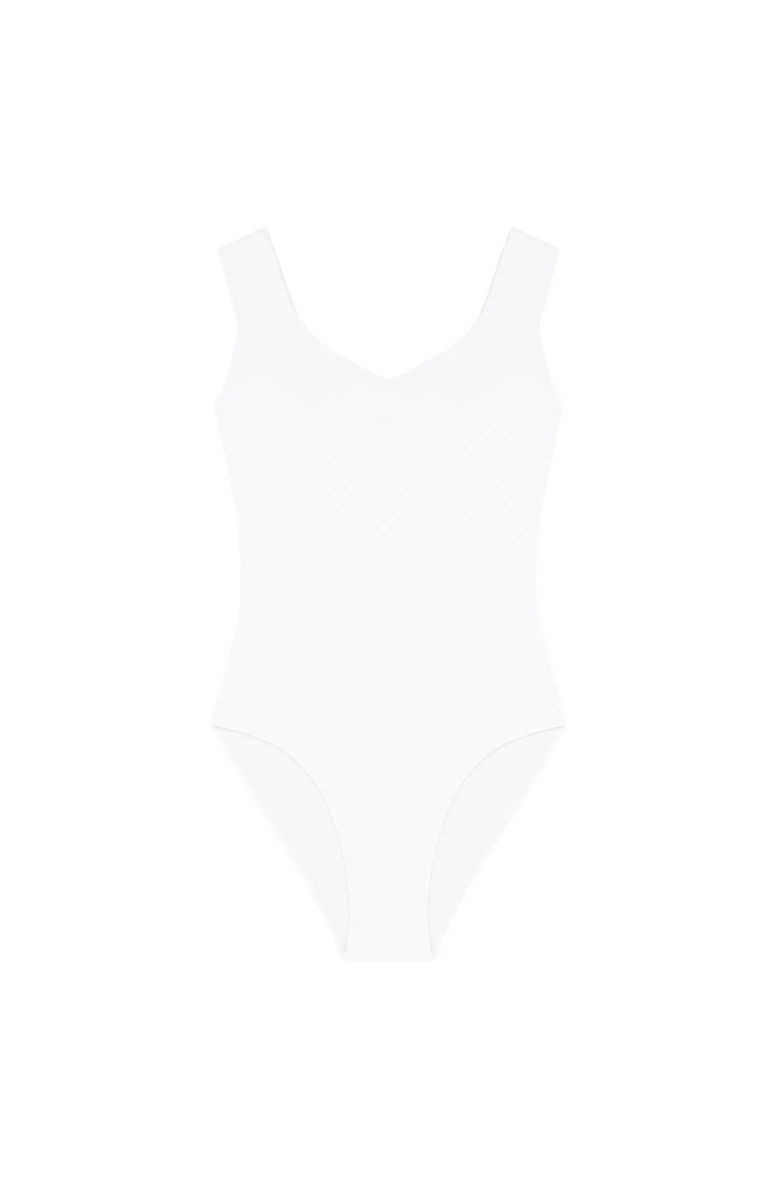 Maillot de bain blanc 1 pièce nageur. Encolure V et bretelles finition « free-cut ». Larges bretelles croisées dos. Entièrement doublé.