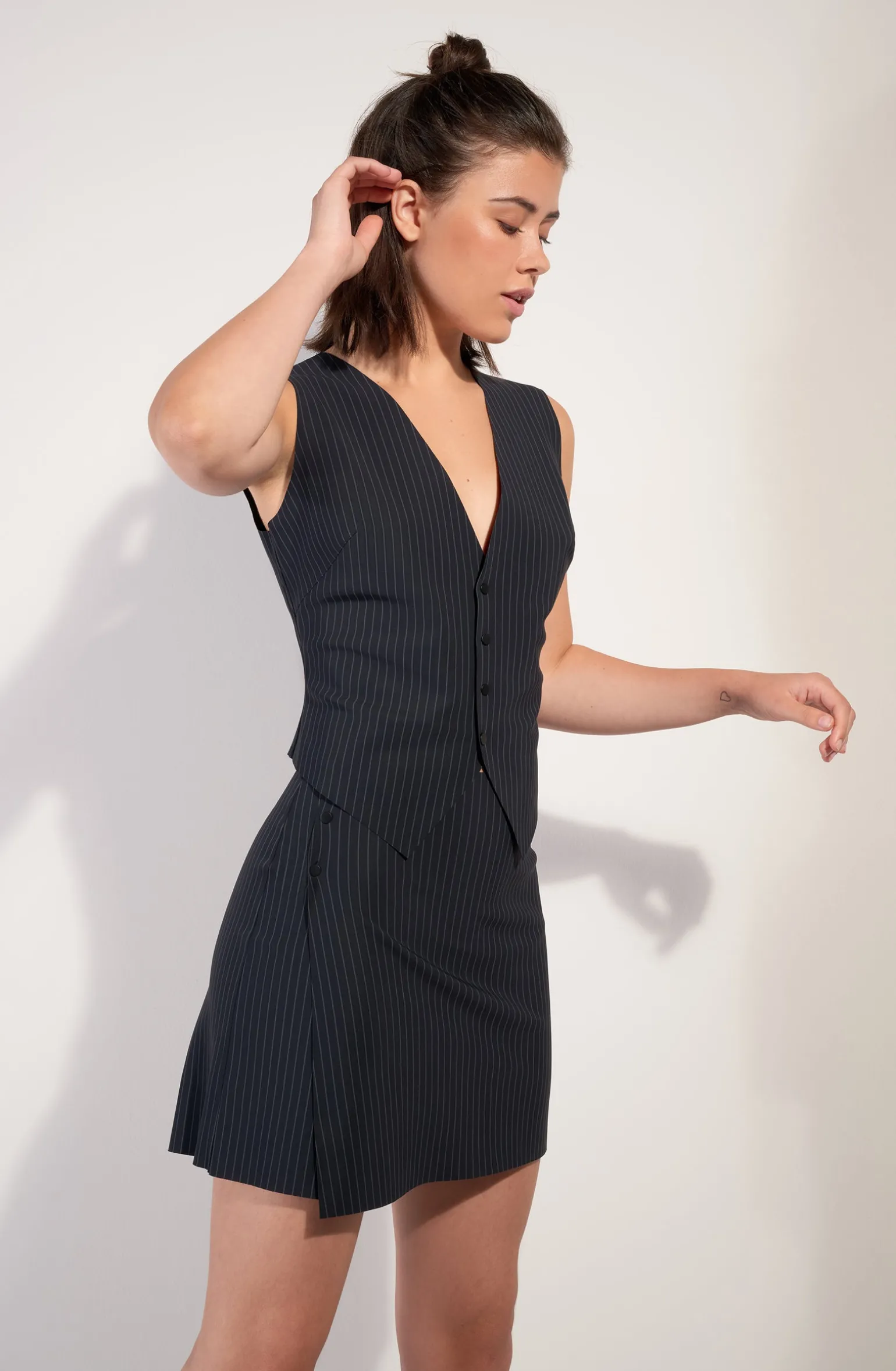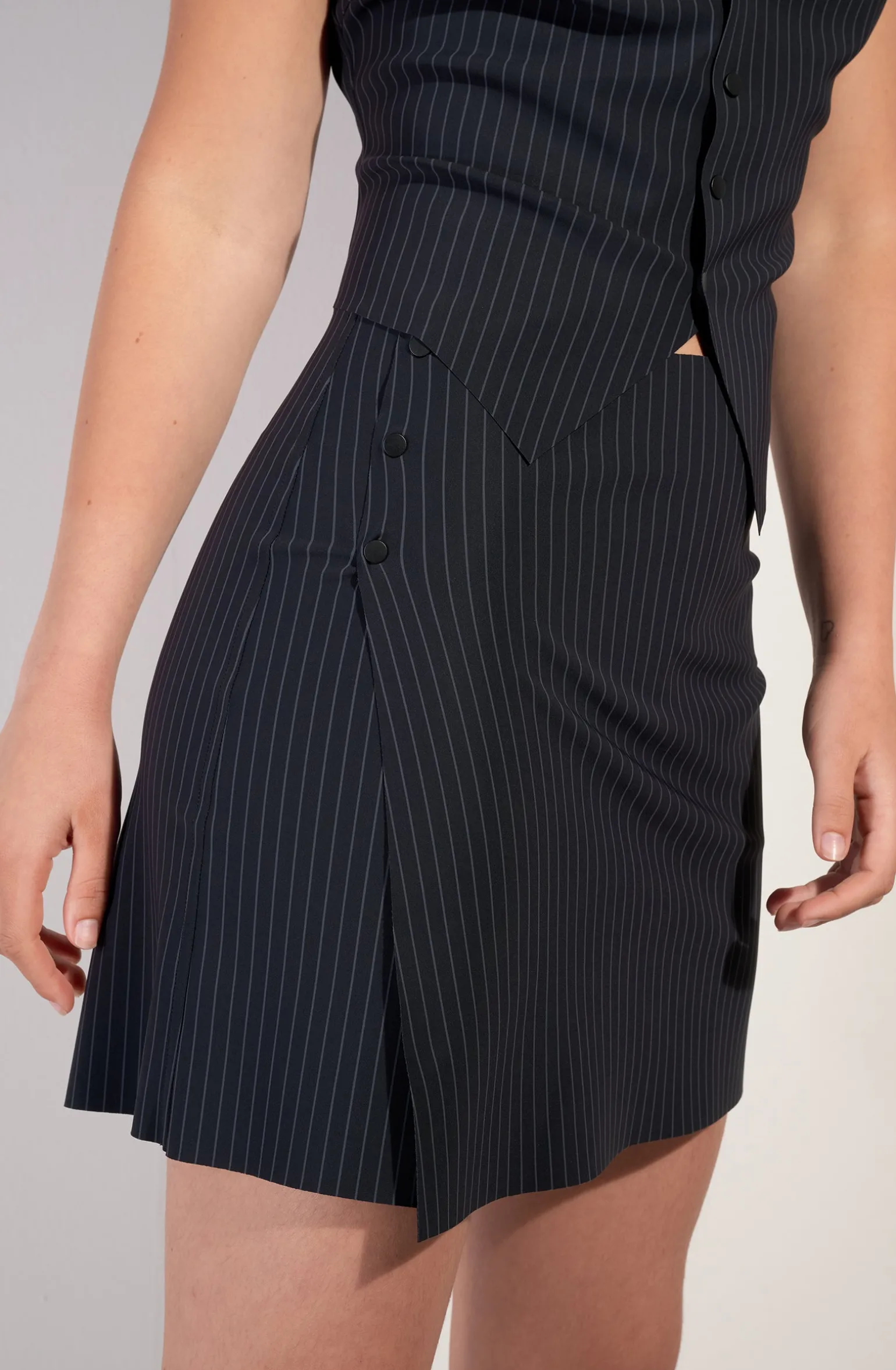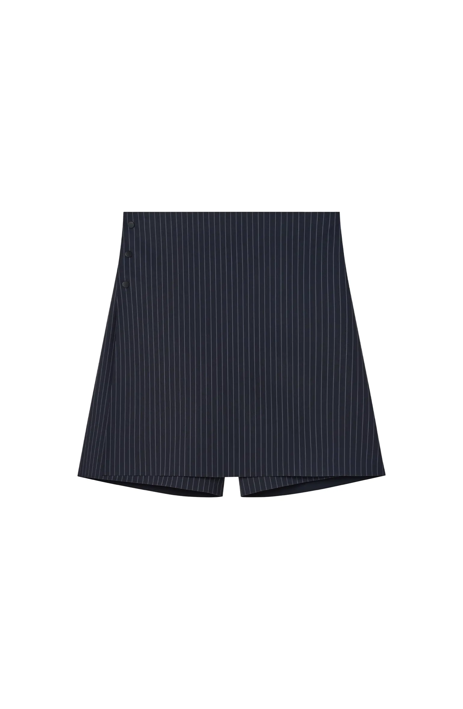 Le short jupe portefeuille Stann joue des effets de superposition avec style. Le pan de la jupe se rabat sur le short avec de délicats boutons-tige. Les finitions sans couture mettent en valeur les formes dans un confort absolu. Noir Rayé avec de fines rayures verticales, gris anthracite, pour dynamiser et allonger la silhouette.