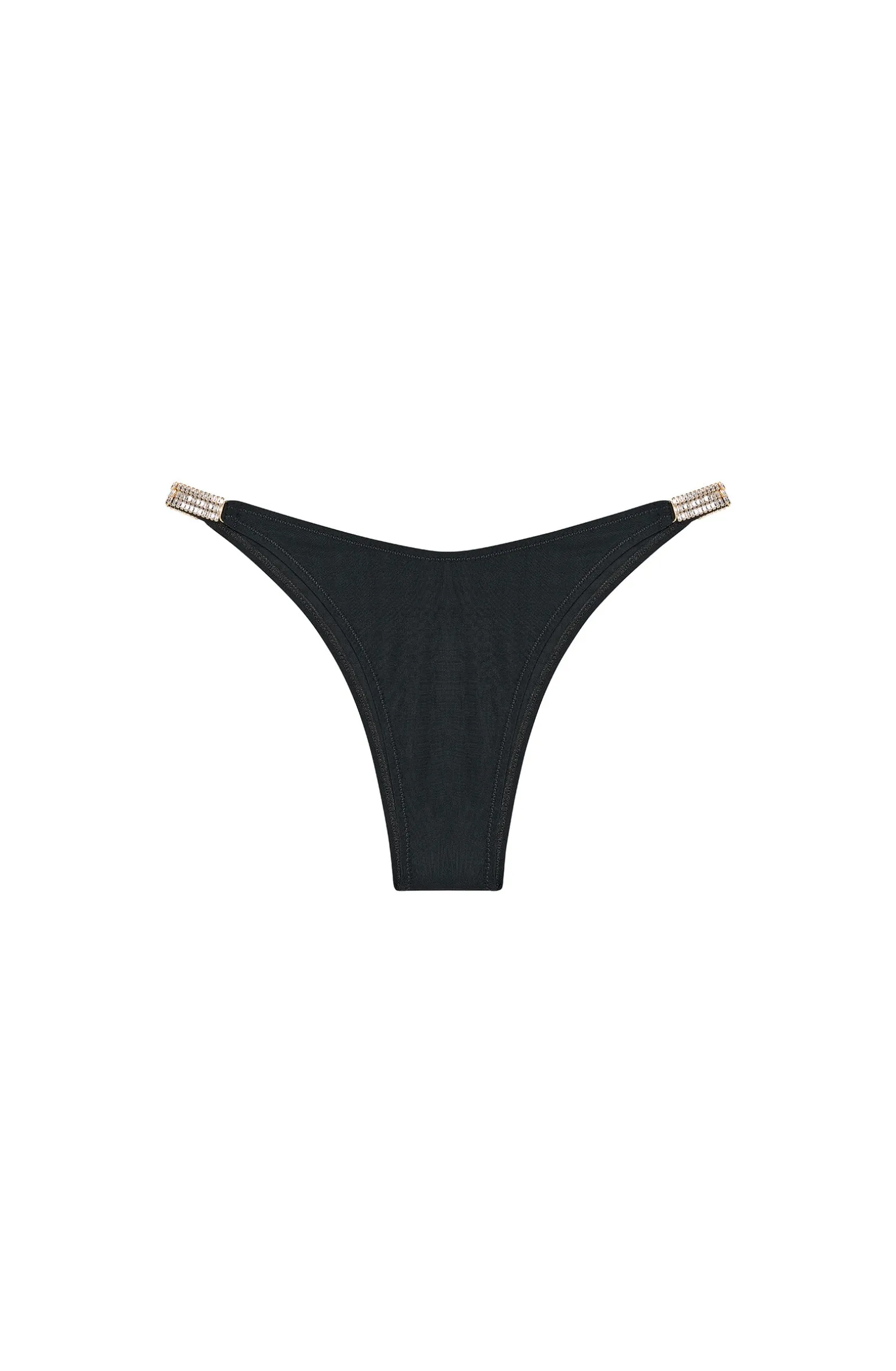 Des bijoux en verre ornent les côtés de cette culotte de bain très échancrée. Ce bikini affine la silhouette avec distinction. Le noir, une couleur intemporelle et toujours élégante.