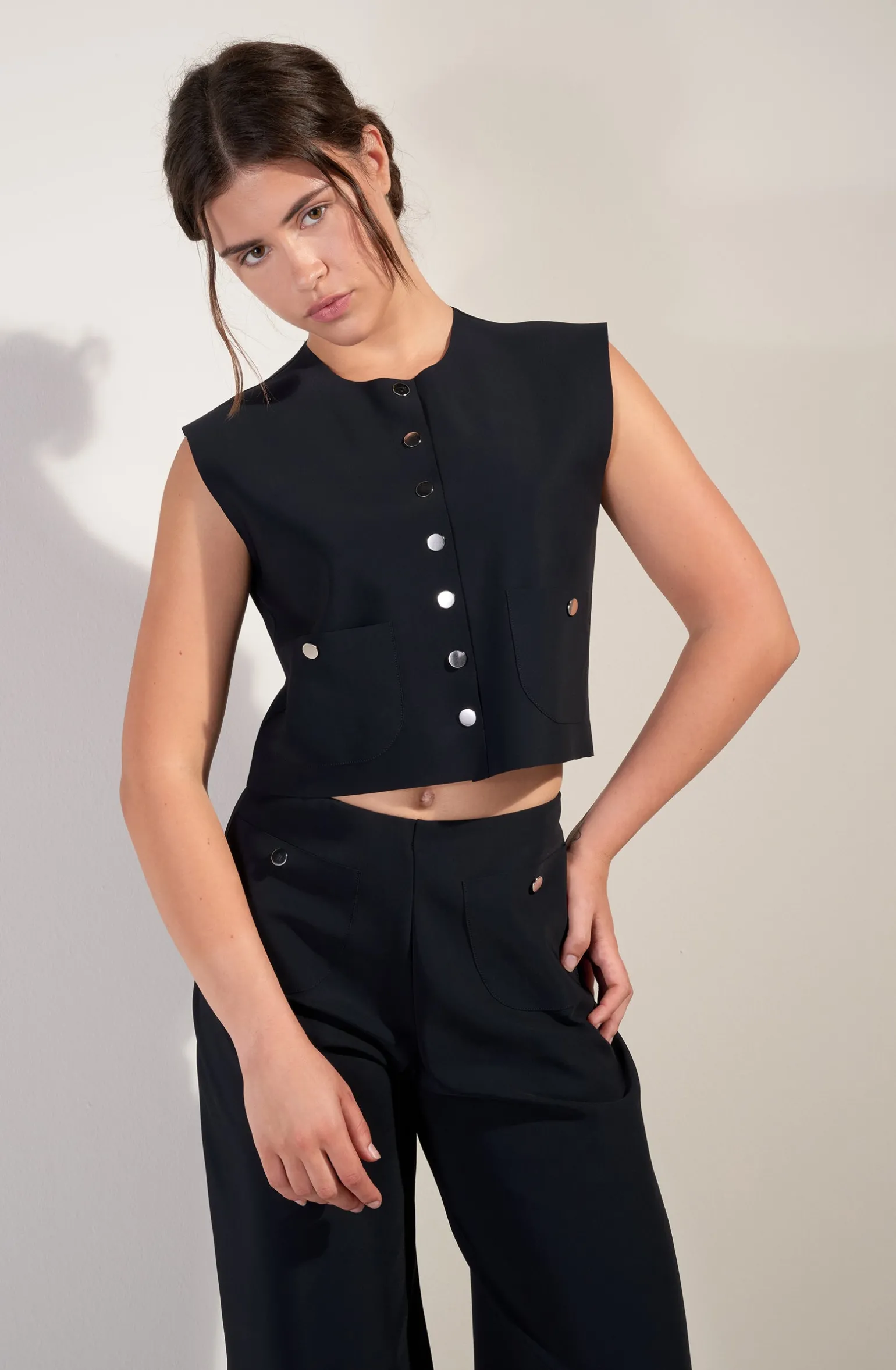 Réinvention du veston rétro sans manche, Tanhi dessine une silhouette intemporelle. Sa coupe, aux finitions sans couture, est structurée de détails délicats : sept boutons-tige réversibles argentés. Ce haut court ultra moderne s’associe avec un pantalon taille haute. Le noir, une couleur toujours élégante.
