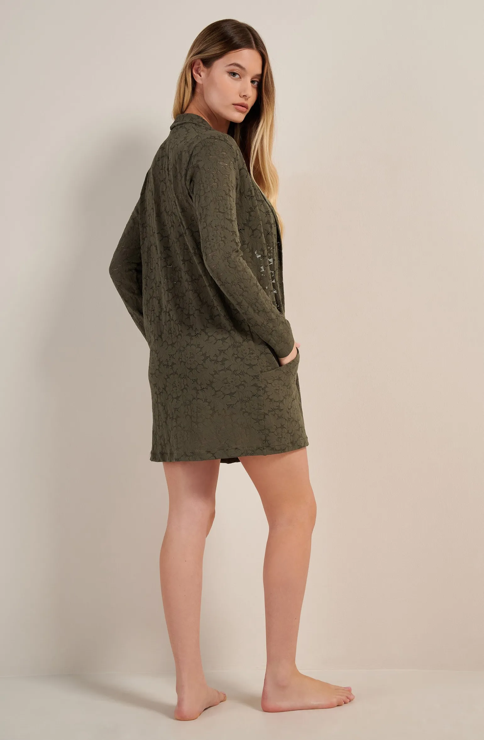 Pour affronter l’hiver en douceur, le long gilet en dentelle française VAEA allie confort et élégance. Ce cardigan ample ouvert sur le devant se pare d’un col écharpe en dentelle doublée, pour un tombé soigné. Lichen, une teinte organique, vert kaki.