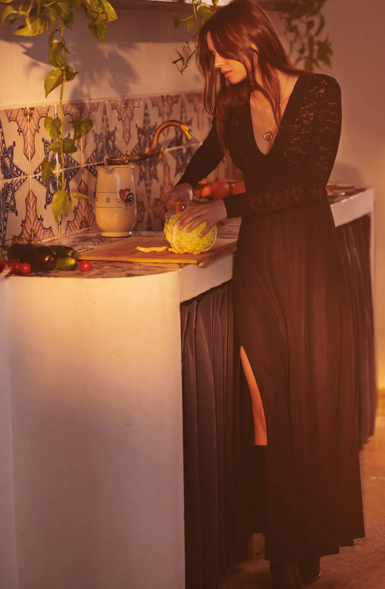 La robe longue VANAO mêle les matières emblématiques de Pain De Sucre. Le haut joue de dentelle, ajourée sur les bras et doublée devant et derrière de tulle chair. Le Bonded structure le décolleté et la jupe fluide fendue sur le côté, offre une silhouette sculpturale. Lichen, une teinte organique, vert kaki.